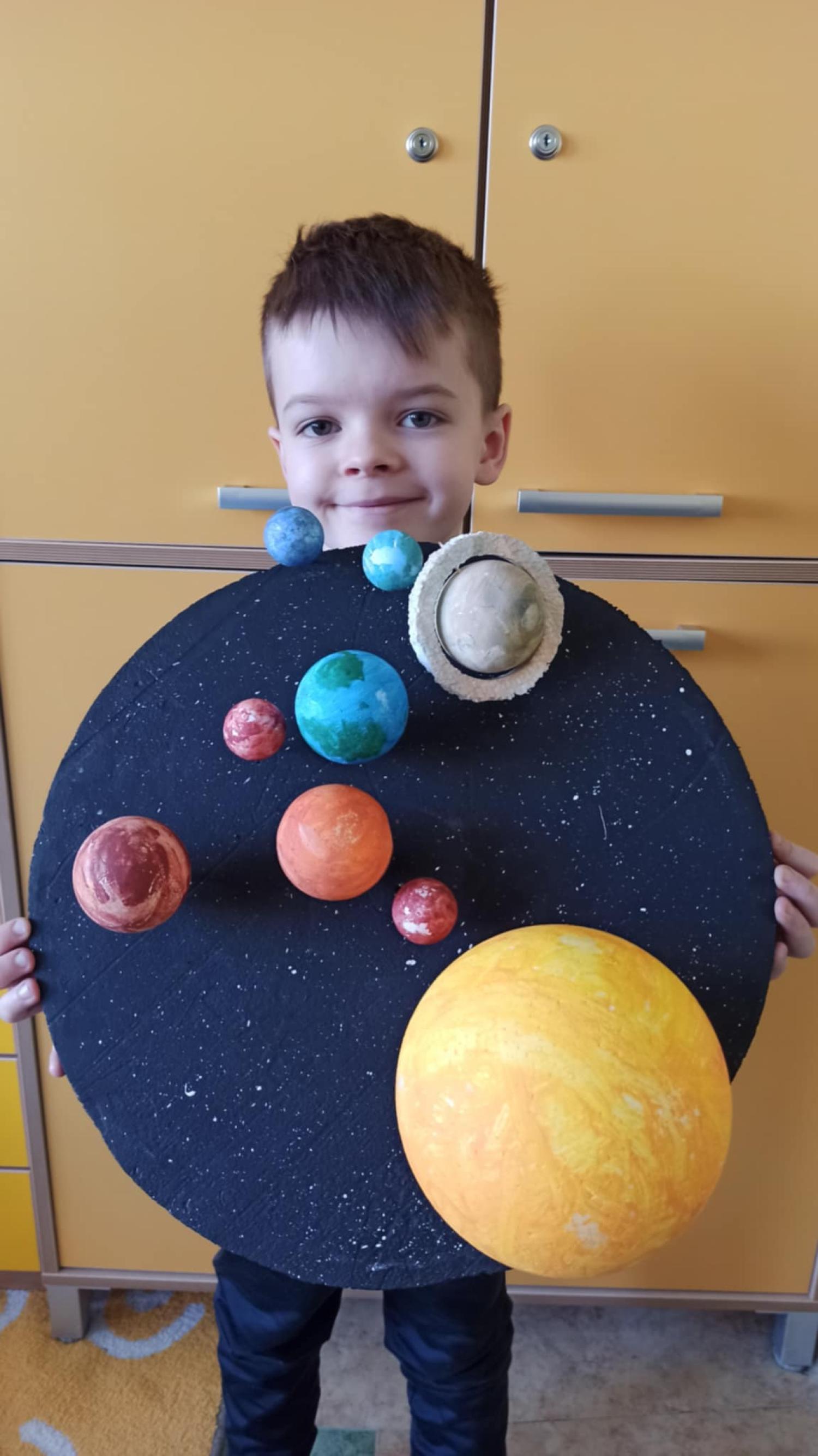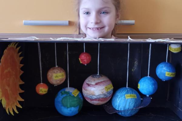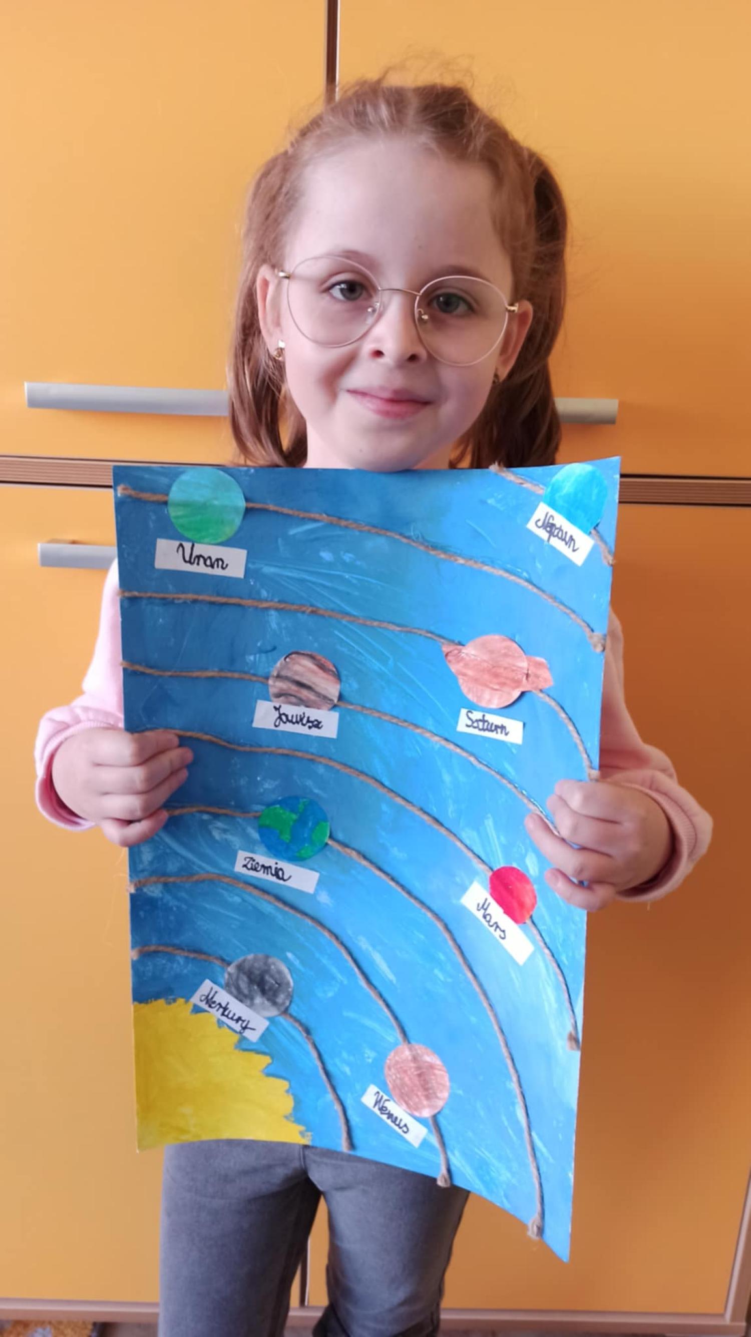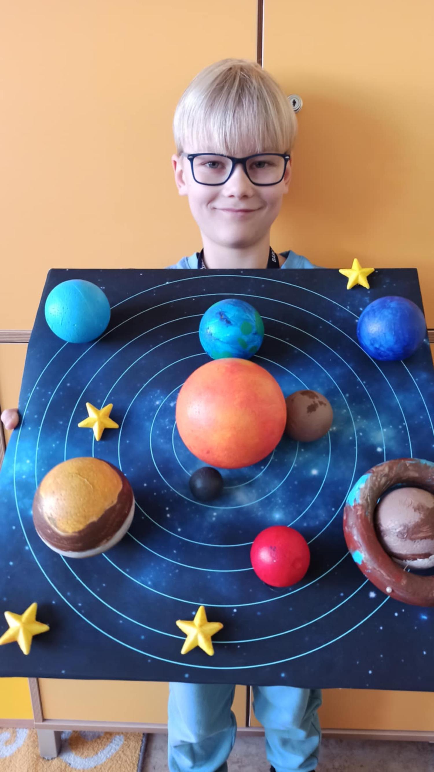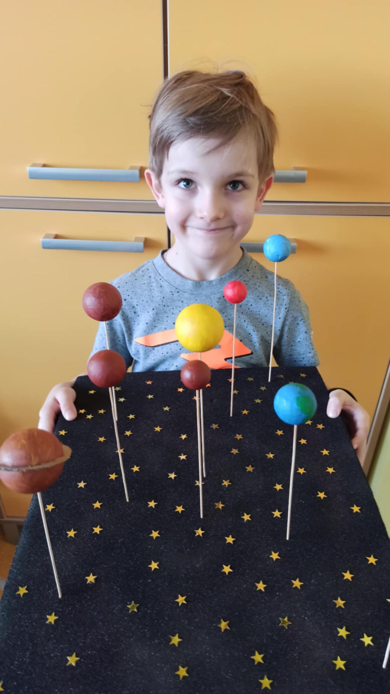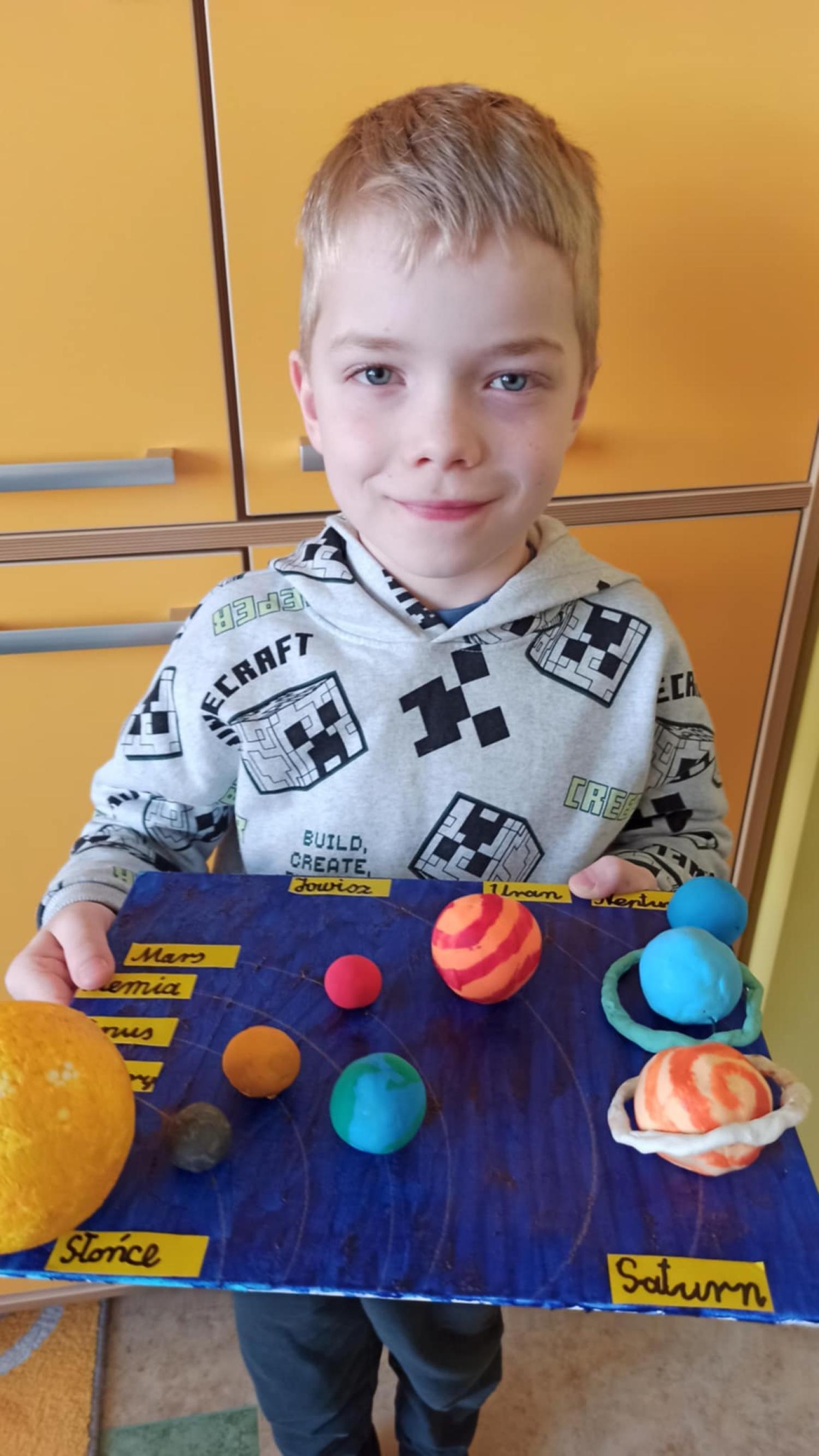 Mali odkrywcy z klasy 1a poznają kosmos Uczniowie klasy 1a wyruszyli w niezwykłą podróż… aż do gwiazd! Podczas zajęć dzieci poznały postać Mikołaja Kopernika oraz dowiedziały się, czym jest Układ Słoneczny i jakie planety krążą wokół Słońca. Pierwszoklasiści z ogromnym zainteresowaniem słuchali ciekawostek o kosmosie, oglądali ilustracje planet oraz rozmawiali o tym, dlaczego odkrycie Kopernika było tak ważne dla świata nauki. Chętni uczniowie podjęli się dodatkowego wyzwania i wykonali własne projekty Układu Słonecznego. Powstały piękne, kolorowe prace, które pokazują nie tylko zdobytą wiedzę, ale także kreatywność, zaangażowanie i pasję do odkrywania świata. Brawo klasa 1a! Jesteśmy dumni z Waszej ciekawości i aktywności!